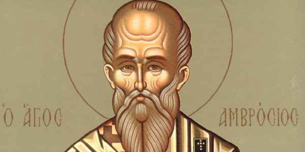 Свети Амвросије, епископ Милана и учитељ вере, рођен је око 340. године после Христа у Триру, у данашњој Немачкој, тада делу Римског царства. Потекао је из племените хришћанске породице; његов отац био је префект Галије. Према предању, док је Амвросије био дете, рој пчела слетео му је на лице и оставио кап меда, што је његов отац протумачио као знак будуће речитости свога сина.